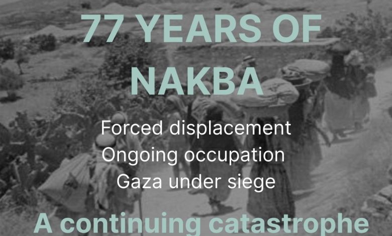 May 15th marks 77 years since the Nakba, “The Catastrophe.” On this day in 1948, 750,000 Palestinians were violently uprooted from their homes, their villages destroyed, their land stolen, and their homeland fractured, a process of ethnic cleansing that did not end in 1948.
